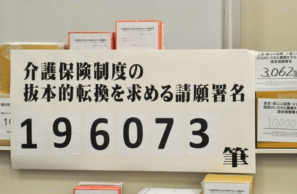 7団体は署名活動を通じて、介護保険の給付費に占める国庫負担の割合(*)を大幅に引き上げるべきと主張。地域の介護サービスの充実とあわせて、利用者の自己負担や40歳以上の保険料の軽減を求めた。また、介護職の給与を全産業平均のレベルまで上げることも要求した。