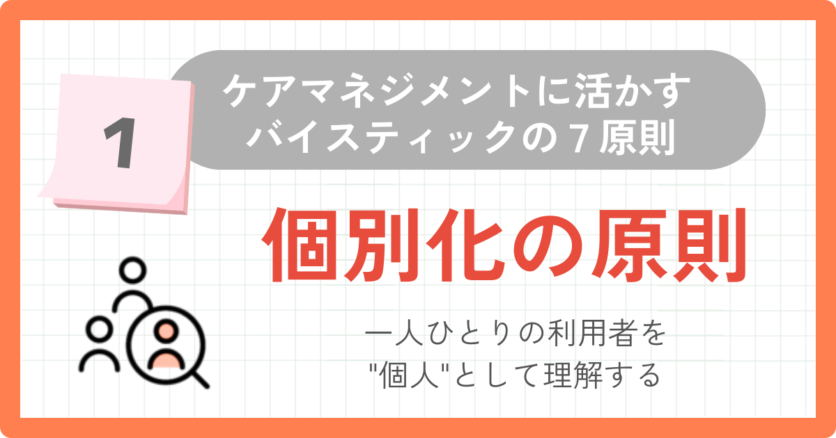 この記事では、バイスティックの7原則*1の中の「個別化の原則」について、ケアマネジャーの現場の一場面に沿って解説します。「認知症の人」といった属性ではなく、その人ならではの人生や個性に目を向け、〝唯一無二の個人〟として関わる重要性を取り上げ、すぐに取り組める「実践ポイント」もわかりやすくまとめています。