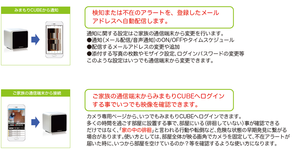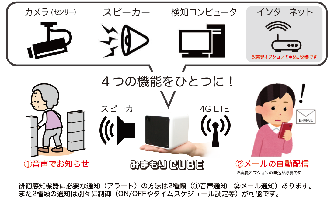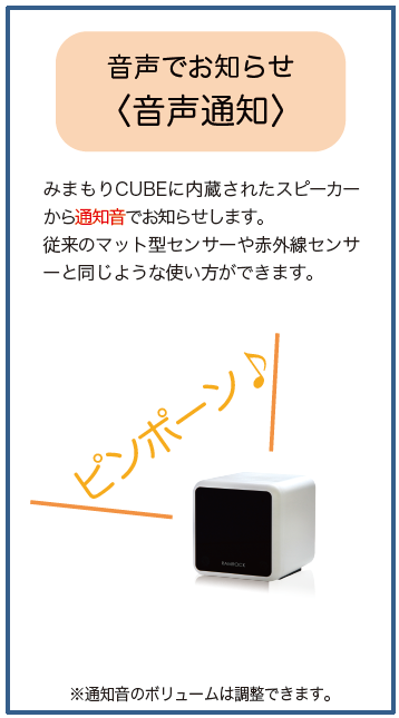 「みまもりCUBE」はカメラ・スピーカー・インターネットを内蔵したオールインワンのシステムで、コンセントにつなぐだけで徘徊行動の検知・画像付き通報・(録音での)呼び止めができるとても便利な徘徊感知機器です。