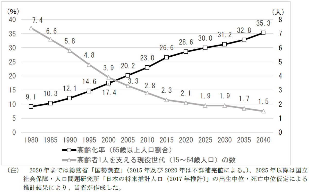一人暮らしの高齢者が増える一方で、支える現役世代の人数は減少し続けています。2025年には一人の高齢者を1.9人で支える構造となり、医療や介護など社会保障の財源や人材の不足、いわゆる「2025年問題」に直面しています。