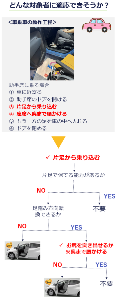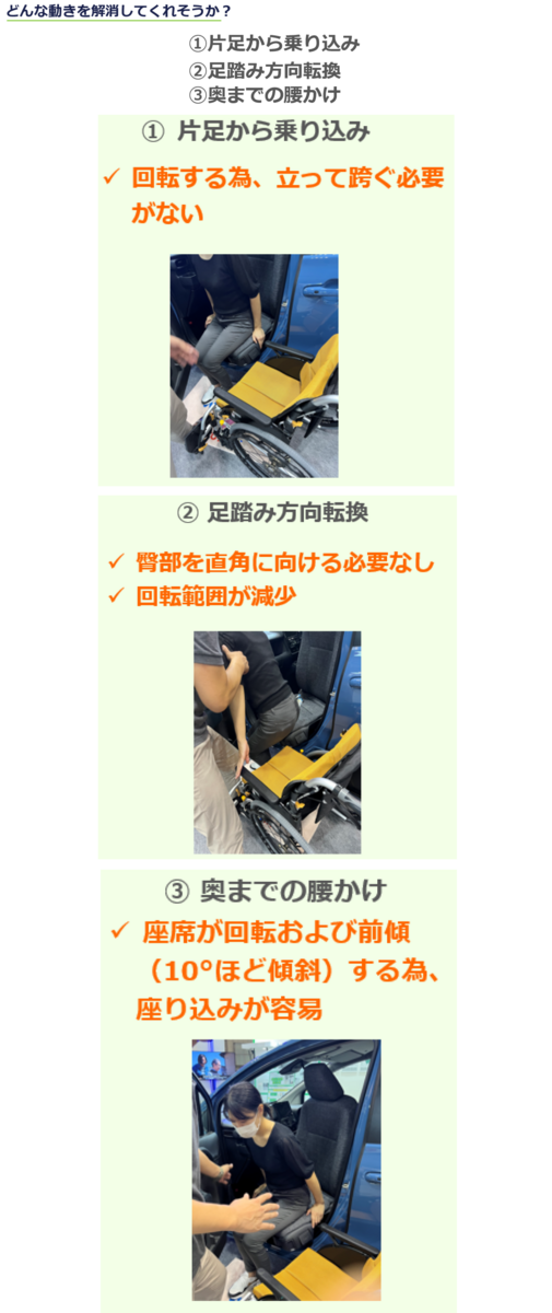 難しいのは、片足から乗り込んで座席の奥まで腰掛ける動きです。片足立ちが3秒(最低でも1、2秒)保てない方、足踏み方向転換ができない方、ゆっくり着座できない方、お尻を奥まで移動できない方の乗降を、ターンチルトシートがサポートします。