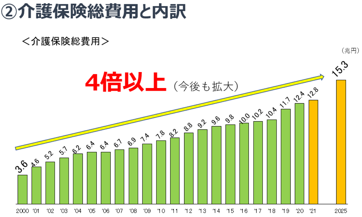 超高齢者社会における現役世代の負担増加の一例として、介護保険にかかる費用を見てみましょう。介護保険が始まった2000年には、介護保険の総費用は3.6兆円でしたが、2025年には15兆円を超え、当初の4倍にまで拡大する見込みです。