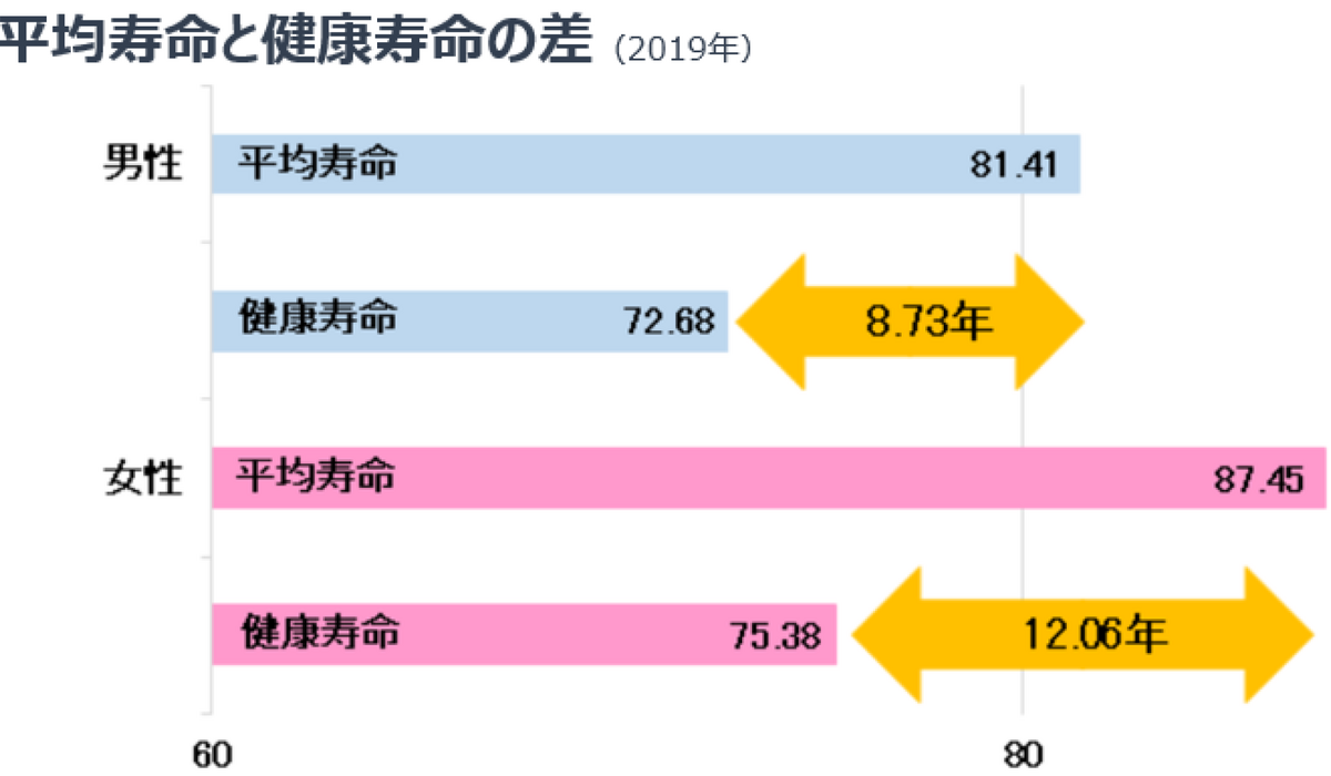 平均寿命は男女ともに伸び続けており、高齢者一人に対する支え手となる現役世代の人数が減少していくことが推定されています。このような超高齢者社会において、現役世代の負担を軽減するためには「平均寿命に対する健康寿命」がますます大切となっていきます。現在、健康寿命と平均寿命の差は、男性で8.73年、女性で12.06年となっており、健康寿命を延ばすことで、心身ともに自立した生活を送ることができ介護期間の短縮が期待できます。