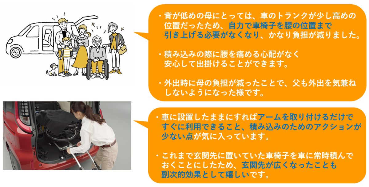 重さを気にして車いすを選んでいた方、車いすの積み下ろしに苦労していた方の負担を軽減し、車いすの積み下ろし時に車を傷つけるのを防ぎます。