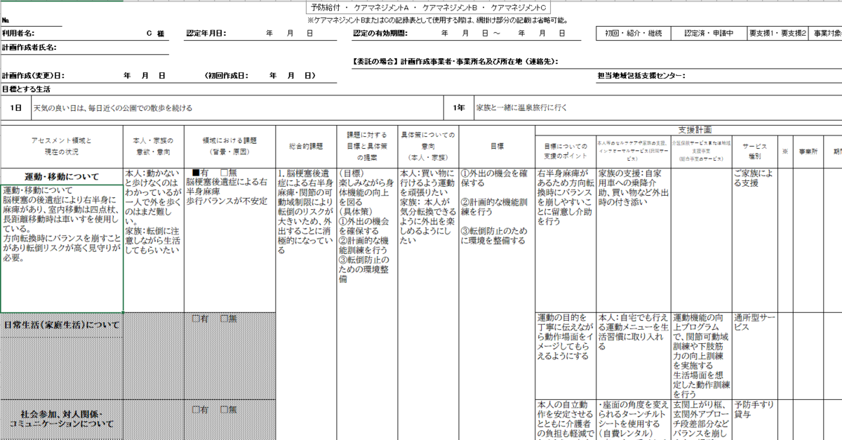 脳梗塞の既往歴があり、麻痺からくる可動域制限により転倒のリスクが大きいため、外出することに消極的になっている方。本人は買い物に行けるようになりたいと考えており、家族は本人が気分転換できるように外出を楽しめる支援をしたいと考えている。目標のひとつである「外出の機会を確保する」ための支援計画として、デイサービスでの機能訓練(介護保険サービス)と並行していつでもウェルキャブを活用することで家族との外出もサポートし、生活全体の活性化を目指すケース。
